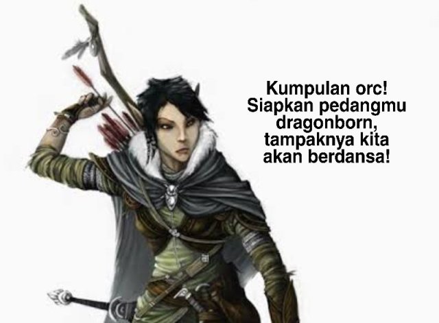 Nah, berikut inilah yang mungkin akan menjadi kesulitan utama dalam menggunakan bahasa Indonesia di sesi bermain D&D, yaitu dialog NPC. Ketika party tiba ke sebuah tavern, mereka berjalan ke bar ketika seorang wanita dwarf yang berjanggut menyambut kalian, dia berkata, “Aarr! Selamat datang, adventurers! Kalian terlihat lelah, silahkan, silahkan pesan minuman dan makanan di sini.” Walau begitu, menurut saya, selama diperankan dengan “gaya mendongeng” dan penuh keyakinan, maka hal itu tidak menjadi terlalu awkward dan cringey, iya kan?
